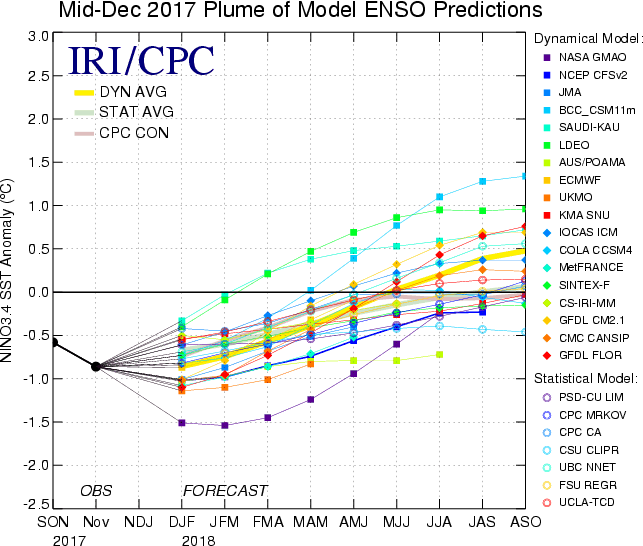 In summary, the probabilities derived from the models on the IRI/CPC plume describe, on average, a preference for weak La Niña conditions through Feb-Apr 2018, with neutral regaining highest probability status from Mar-May through the end of the forecast period in early autumn 2018. Chances for El Niño are very small through Apr-Jun 2018, rising to 28% for Jun-Aug and 41% for Aug-Oct. A caution regarding this latest set of model-based ENSO plume predictions, is that factors such as known specific model biases and recent changes that the models may have missed will be taken into account in the next official outlook to be generated and issued early next month by CPC and IRI, which will include some human judgment in combination with the model guidance.